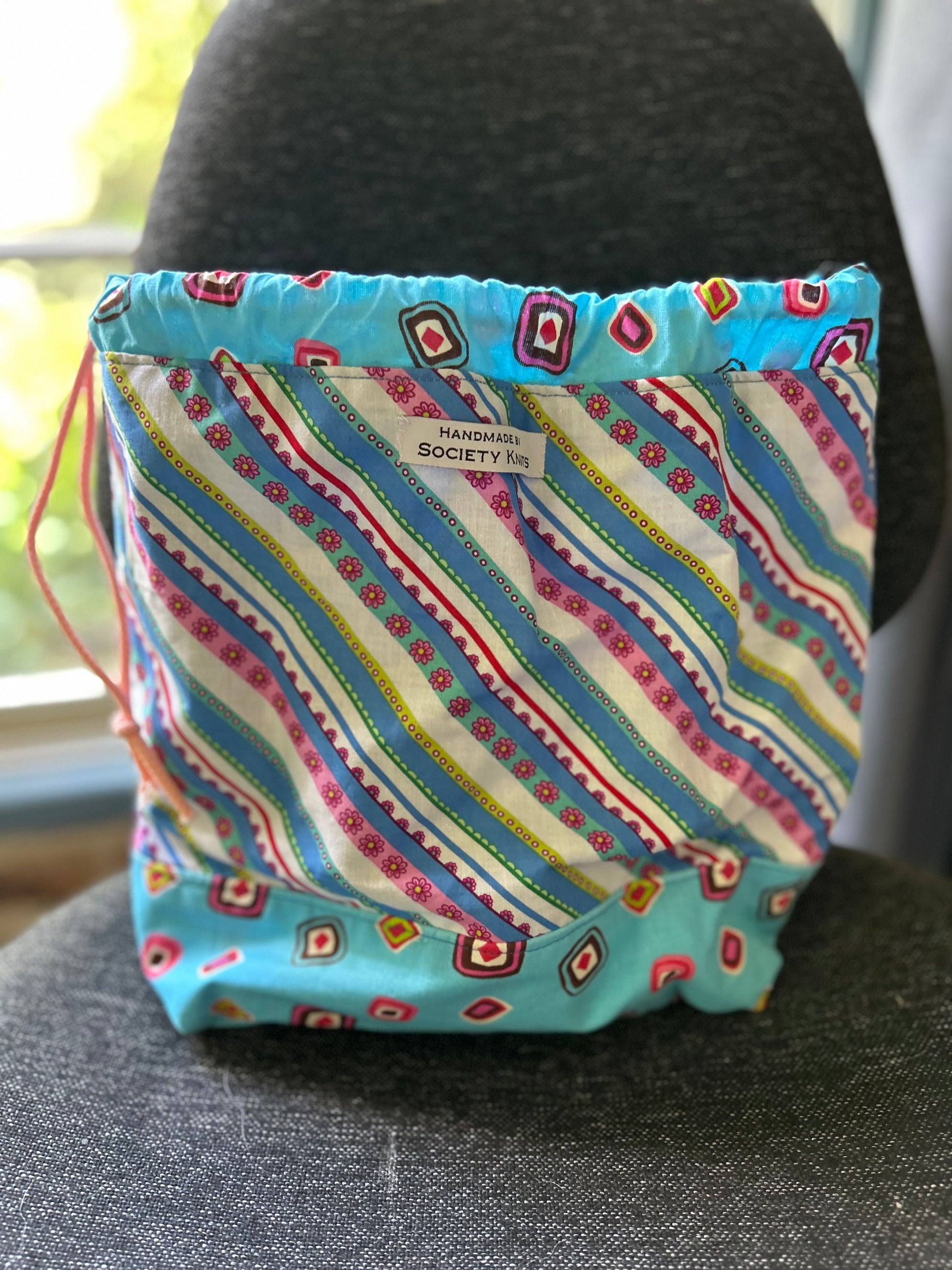 Made using leftover scraps of fabric from past projects and ideas. Lovingly stitched together and drawn up by a reclaimed ribbon drawstring. These are one of a kind pieces that are a perfect gift for yourself or a knitting or crochet friend.